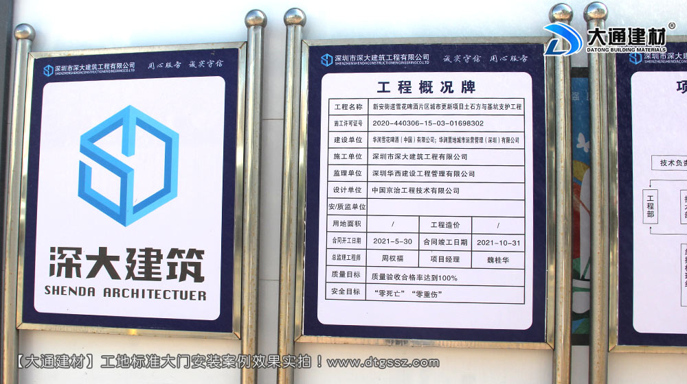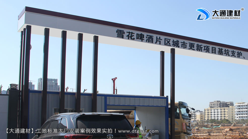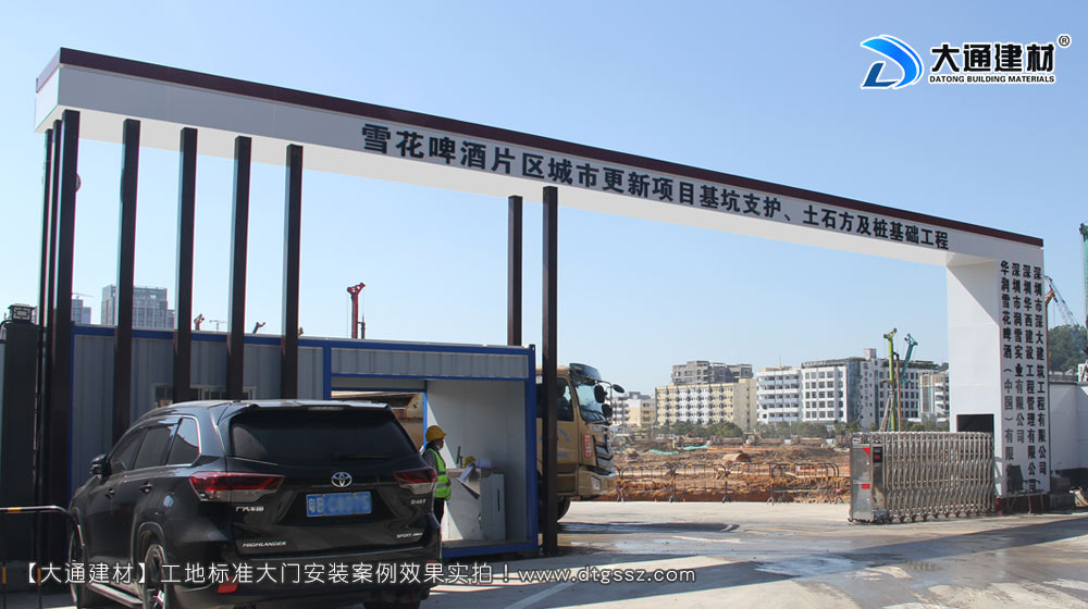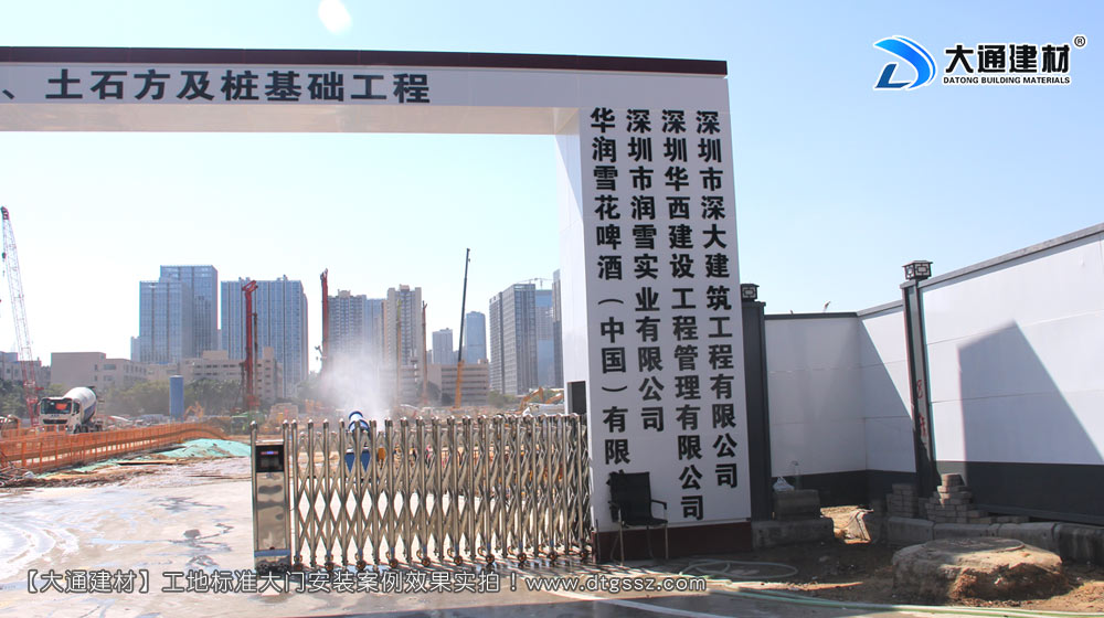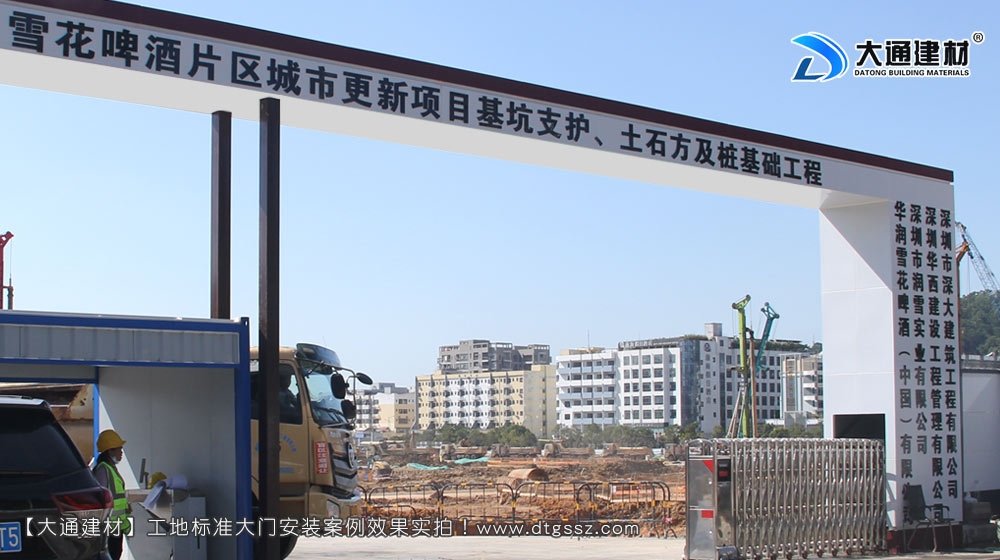 雪花啤酒(中國)有限公司,深圳雪花啤酒廠片區基坑支護、土石方與樁基工程施工大門定制安裝, 位于廣東省深圳市寶安區新安街道留仙三路,由深圳市深大建筑工程有限公司施工,工地大門選擇深圳市大通建材有限公司定制的鋼結構工地施工大門,工地大門已經安裝完成,現場實拍照片展示;