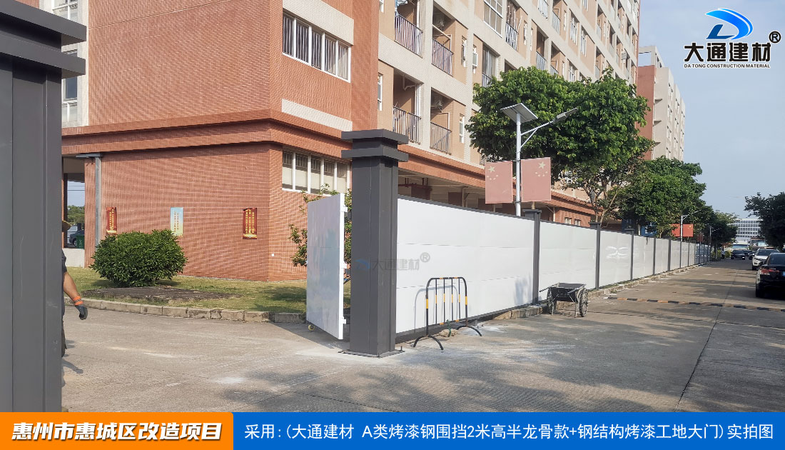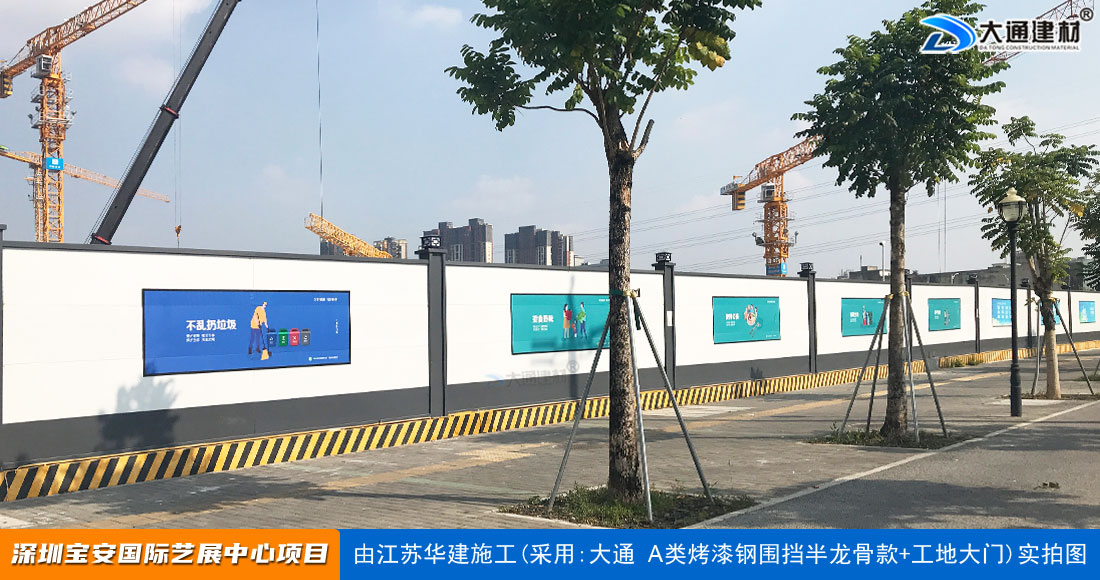 建設工程施工工地四周應按規定設置連續、密閉的鋼結構施工圍擋,建造多層、高層建筑的還應設置安全防護設施。在市區主要路段和市容景觀道路及市場、機場、碼頭、車站廣場等人流量、車流量比較多的地方設置的施工圍擋的高度不得低于2.5m,在其它路段設置的圍擋的高度不得低于1.8m。而深圳市大通建材A類鋼圍擋烤漆半/無龍骨款的標準高度是2.5米、長度為6.3米一擋,而圍擋高度特殊需求的如3/米/4/米/5米/6/米等高度的可以進行定制化生產。