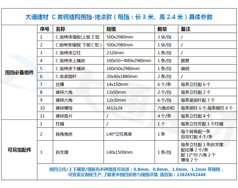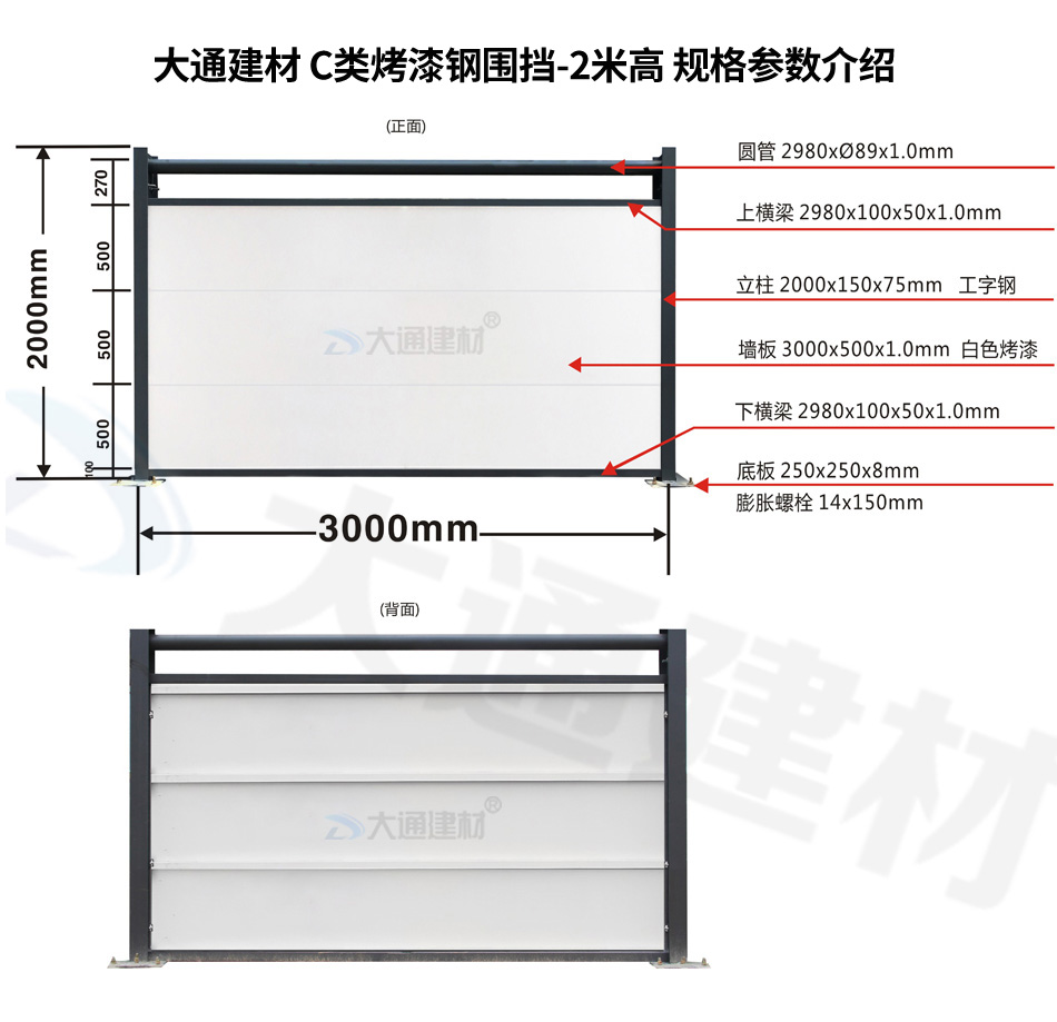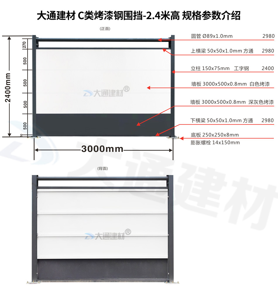 大通建材C類裝配式鋼結構圍擋-烤漆款的烤漆鋼板厚度是0.8mm,采用150*75mm工字鋼立柱,同時每一擋圍擋的長度都是3米,高度是2.4m,其它具體參數規格請參照上述展示的圍擋參數圖。