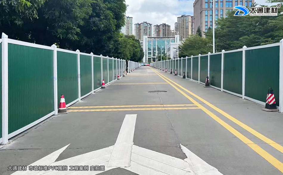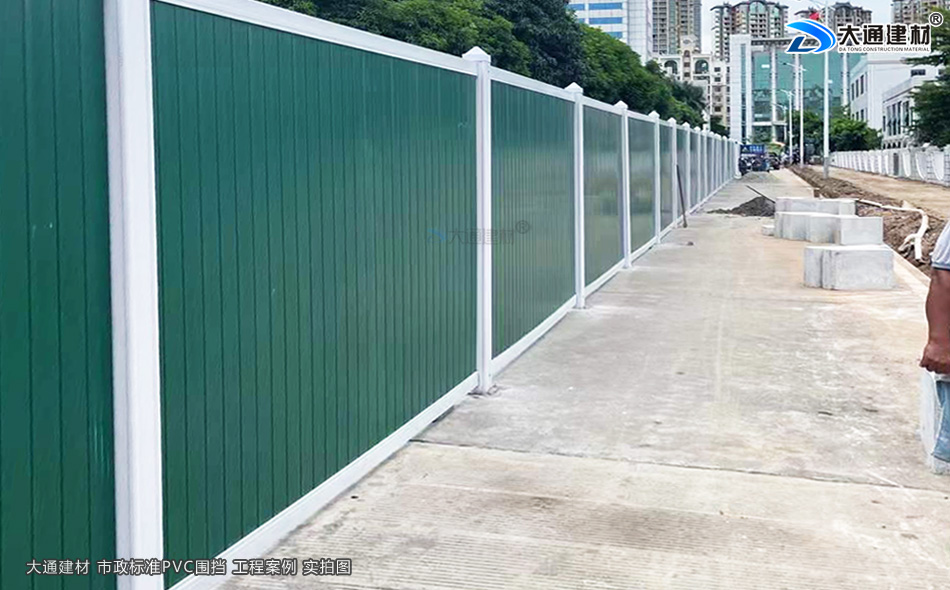 深圳大通建材綠色PVC圍擋表面經(jīng)烤漆工藝噴涂、鮮艷的綠色、表面光滑,具有美觀環(huán)保、安全穩(wěn)固、經(jīng)久耐用等特點,適合市政道路建設施工、地產(chǎn)工程項目建設施工管網(wǎng)改造施工、路橋維護施工等工程選用。
