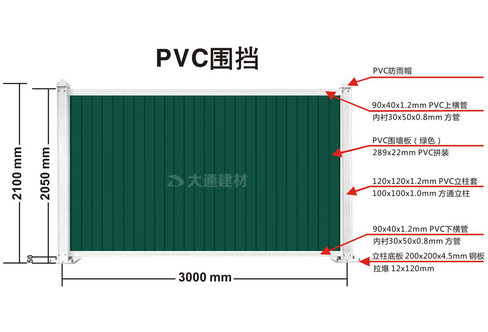 深圳市大通建材有限公司于2021年9月推出PVC圍擋系列新品-綠色PVC圍擋,大通新推出的綠色PVC圍擋與傳統(tǒng)PVC圍擋相比最大的區(qū)別是圍墻板的顏色,傳統(tǒng)款PVC圍擋的圍擋墻板是白色的,而新款的綠色PVC圍擋的圍墻板面采用綠色PVC長條版拼接,立柱、橫管均為白色PVC材料,內(nèi)部均襯塑鋼方通,立柱底板為鋼板,并加斜支撐,增加受力,確保更安全穩(wěn)固。